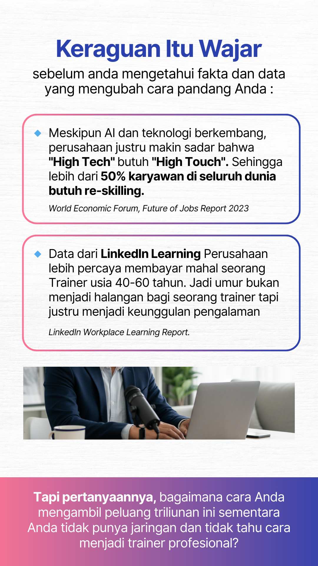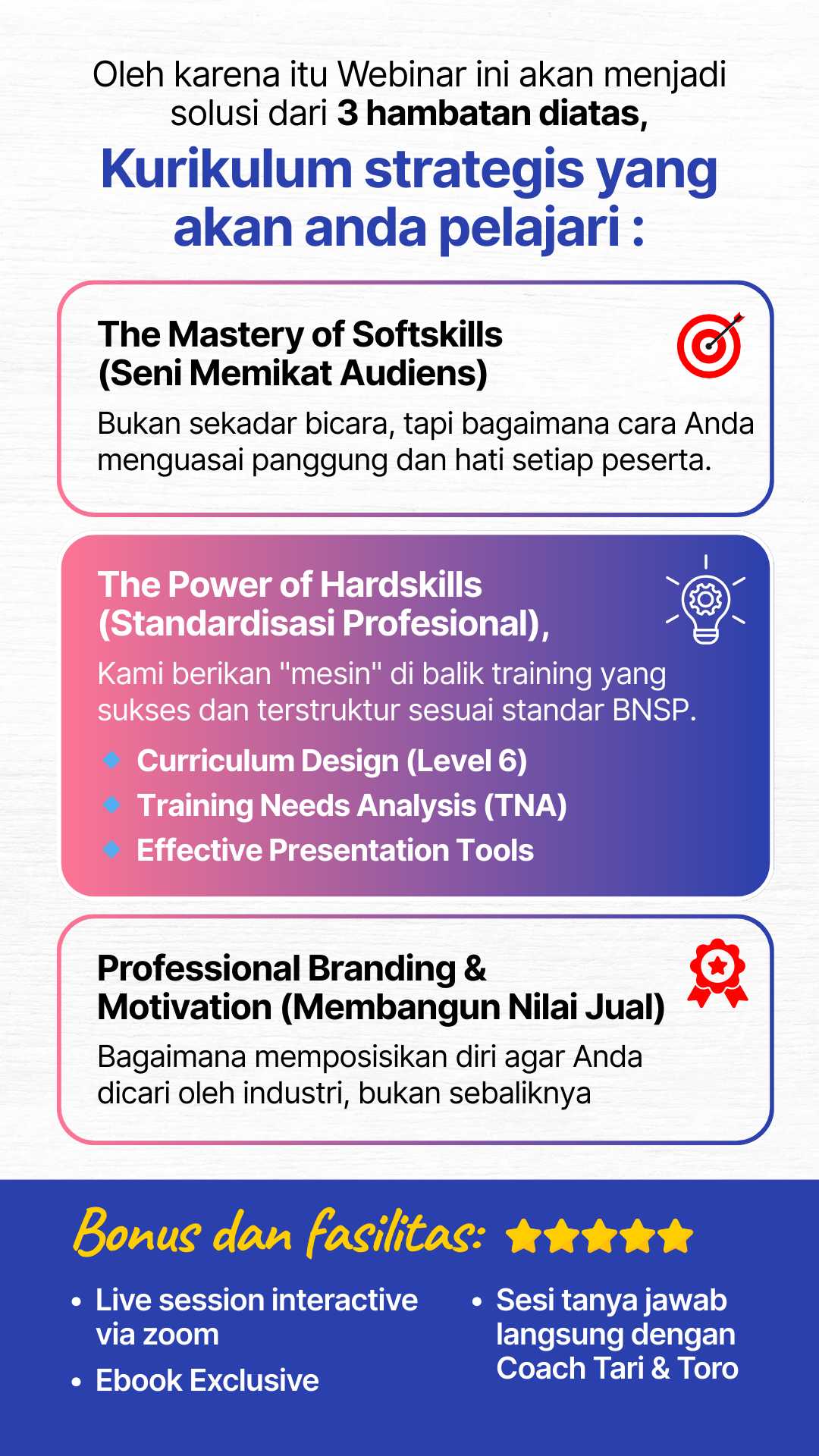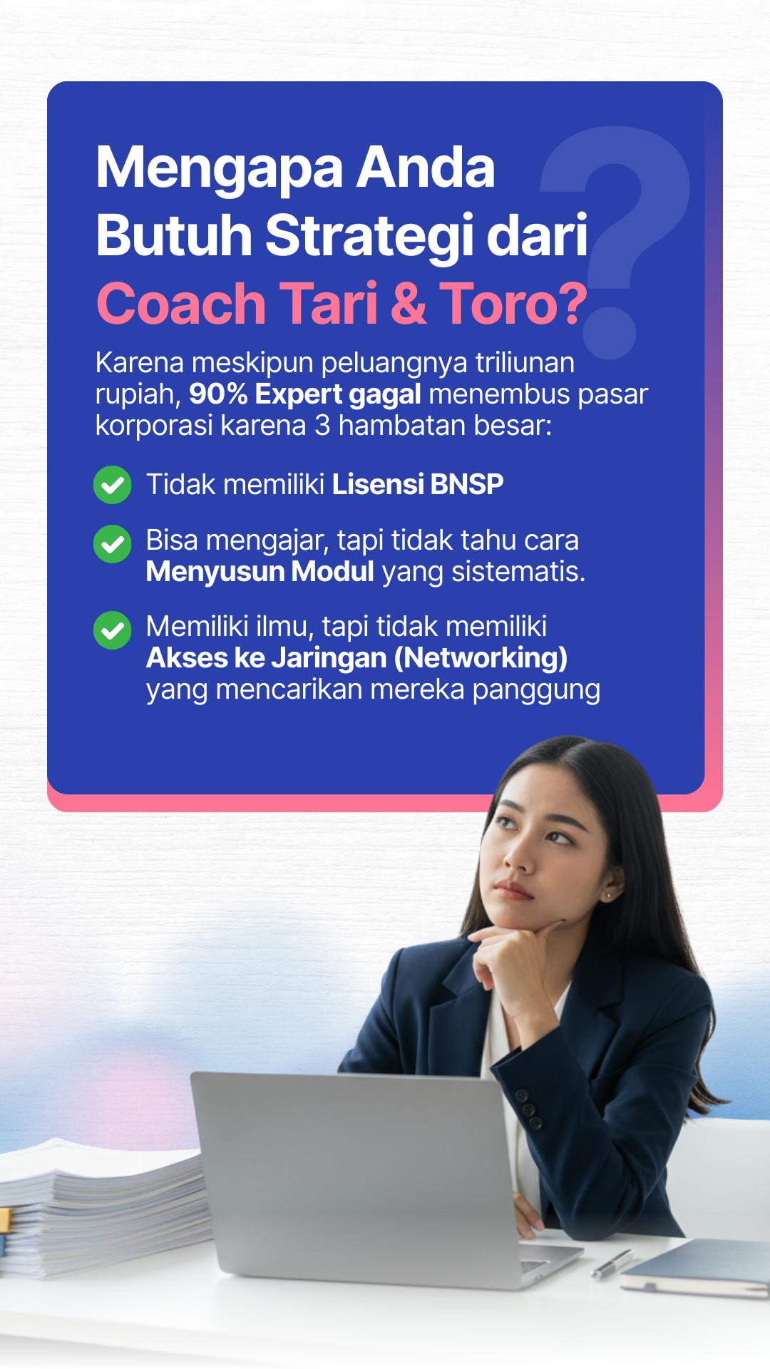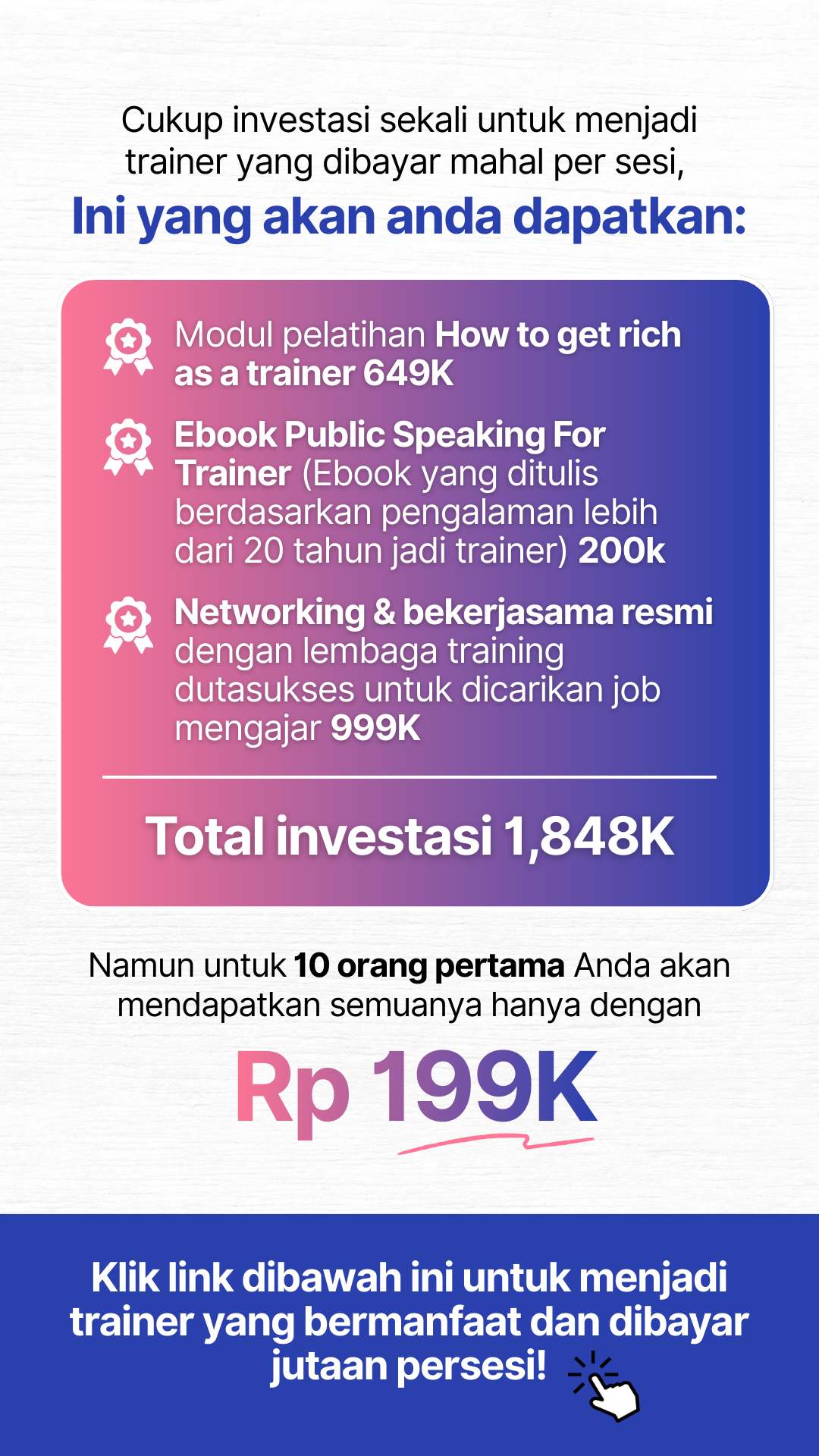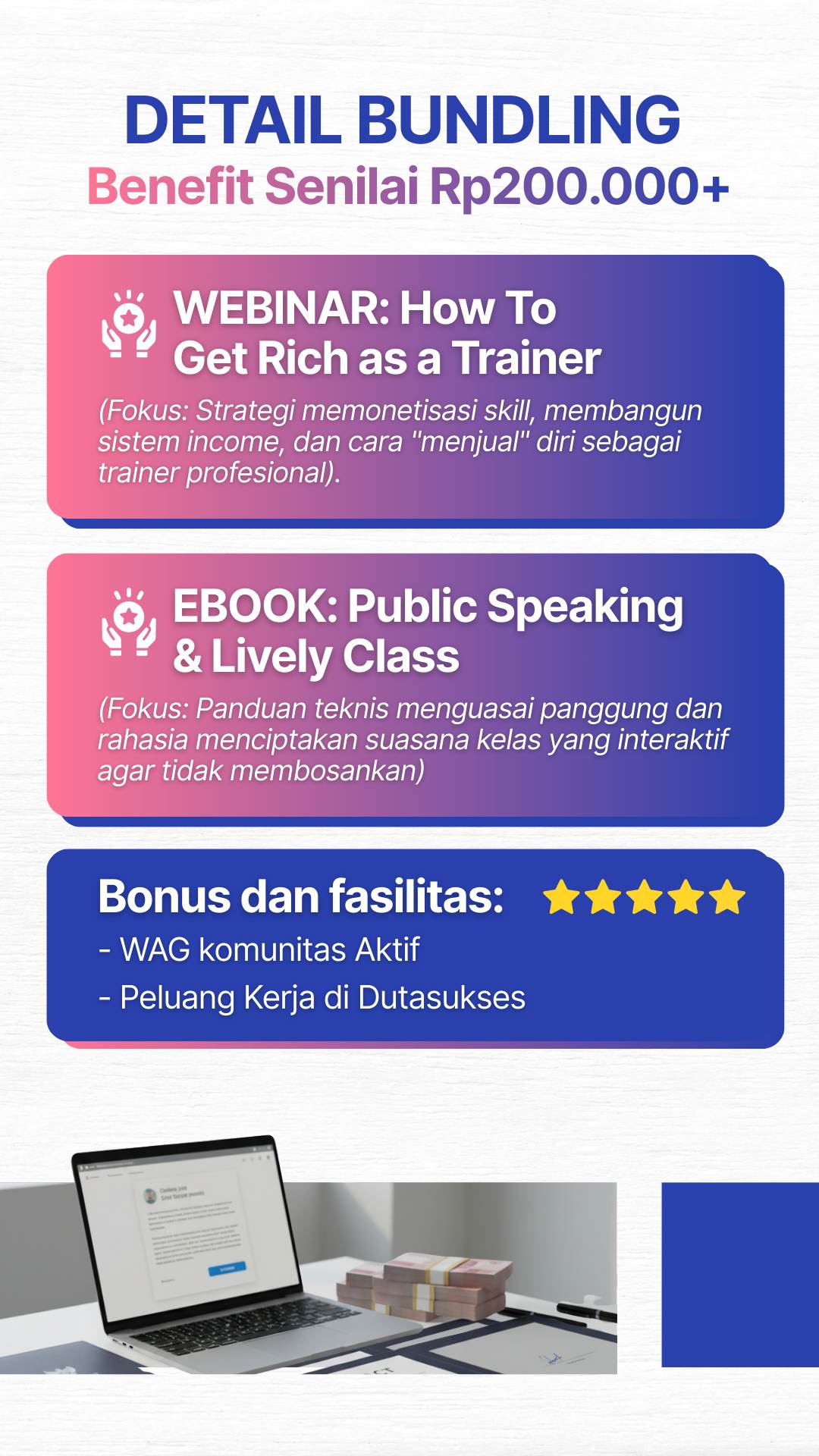 Bantu Anda ubah pengalaman dan keterampilan menjadi sumber penghasilan melalui profesi trainer. Langsung dapatkan job in-house training atau membangun kelas sendiri.